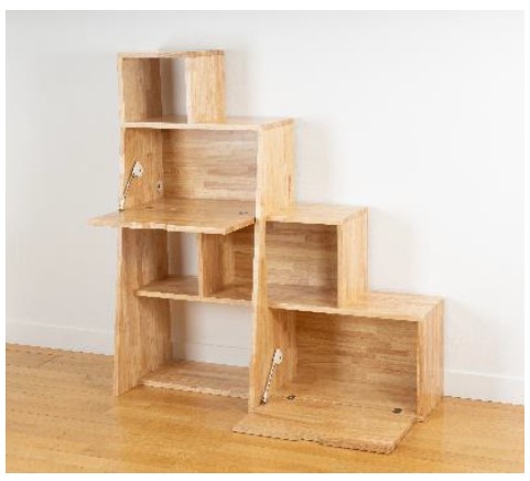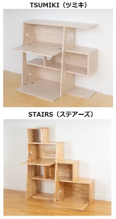 「シェルフ&タワー with Cat」では、2つのタイプの商品が展開されます。付属のフタで穴の位置を変えることで猫が様々なルートでくぐったり昇り降りができ、遊び心をくすぐる設計で収納&ディスプレイの間に猫が顔を出す新発想のふれあい家具の「TSUMIKI(ツミキ)」と、下から上にかけて徐々に高さが低くなっており、猫の足にも優しい階段状の設計でデスクワークの脇で猫が自由に駆け上がったりくつろいだりすることが出来る「STAIRS(ステアーズ)」となります。