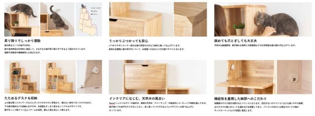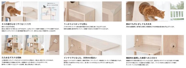 デザイン面もお部屋のインテリアになじみやすい無垢の天然木(ラバーウッド集成材)を使い、猫が遊んでも剝がれたりすることなく、長く使っていただけるようにクオリティを保つ仕上げになっています。また、デスク部は開けると段差なしのフラットになるなど、細部にもこだわった上質な仕上げを施しております。