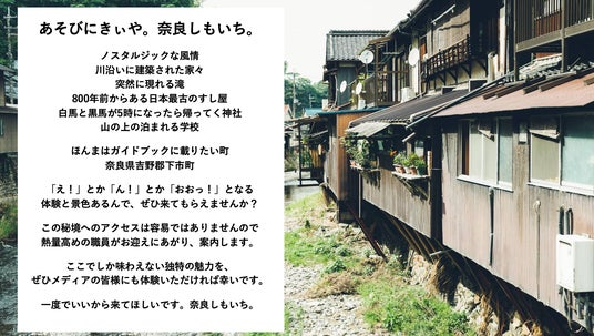 この秘境へのアクセスは容易ではありませんので、「もしあれやったら下市案内するで係」がお迎えにあがり、メディア関係等の皆様に熱量高くご案内いたします。 2024年1月11日木曜日よりメール(kikaku@town.shimoichi.nara.jp)にて受付を開始いたします。