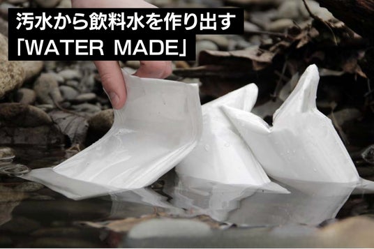 「WATER MADE」は浸透圧の最新技術によって飲料水としては飲むことが出来ない汚水にWATER MADEの専用パックを浸すことで、パック内に浸透圧によって飲料水が作られる防災用品です。地震などの災害が起きた際に飲料水の確保が出来なくなった際に本商品を利用することで簡単に綺麗な飲料水を作り出すことが可能です。