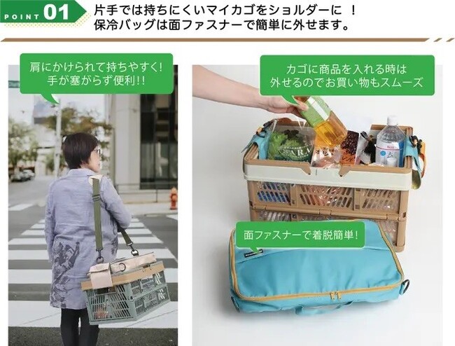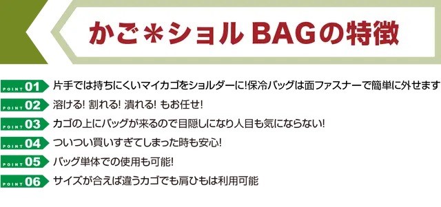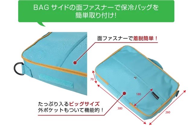 保冷バッグは面ファスナーで着脱簡単!カゴに商品を入れたい時にもすぐに取り外せて便利!カゴに商品を詰め終わったら保冷バックを上に乗せてショルダーベルトの面ファスナーにつけるだけ!