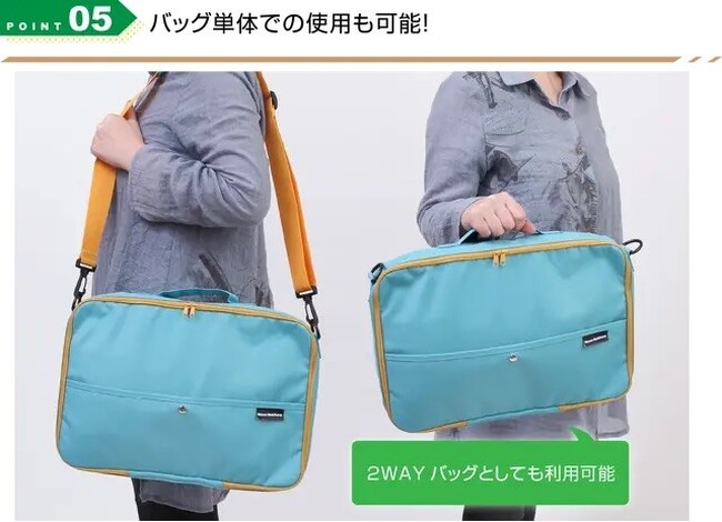 バッグ単体でももちろん使用可能!!手提げタイプとショルダーベルトをつけたタイプとの2WAYでご利用いただけます。収納力もたっぷりで機能的。