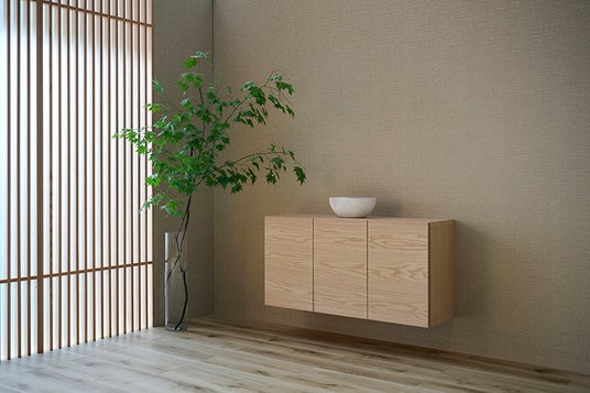 特殊な金物で壁面へ固定し完全フロートタイプを可能にしたローボード。