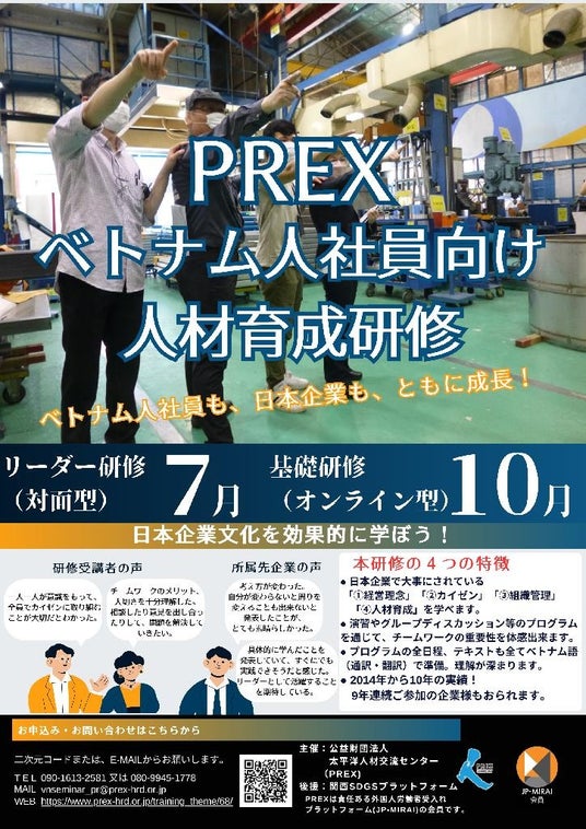 公益財団法人太平洋人材交流センター(PREX)(所在:大阪市/会長:大坪 清)は、日本企業で働くベトナム人社員を対象とする「リーダー育成研修」を実施します。
