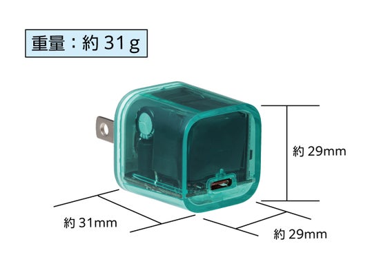 窒化ガリウム(GaN)採用により小型で軽量なACアダプタ。さらにUSB Power Delivery(USB PD)対応でiPhone15などのUSB PD充電に対応した機器をつなぐと最適な電力でより早く、安全に充電することができます。サイズはW:29×D:29×H:31mm、重量はわずか31g