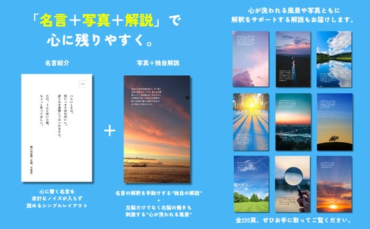 そのような中で、言葉で自己肯定感を高めるための本として、自己肯定感というテーマに特化して名言を集め、それぞれの名言に対して独自の解説と心に残る画像を添えた「自己肯定感を高める名言100」を書籍として発売開始しました。