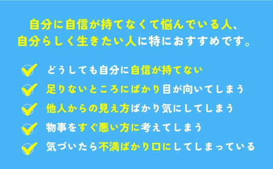 主に、自分に自信が持てない、ありのままの自分を認めることができない、他人からの見え方ばかり気にしてしまう、物事をすぐ悪い方に考えてしまう、気づいたら不満ばかり口にしてしまっている、そういった人たちにおすすめの書籍です。