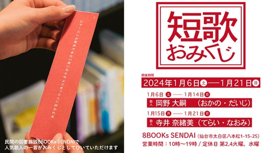 JR長町駅から徒歩10分、仙台市太白区八本松で2022年8月にオープンした民間の図書施設8BOOKs SENDAI(エイトブックスセンダイ / 運営:株式会社 アイ・クルール)にて「新春・短歌おみくじ」と題し、短歌との「偶然の出会い」をお届けするイベントが1月6日(土)より開催中です。