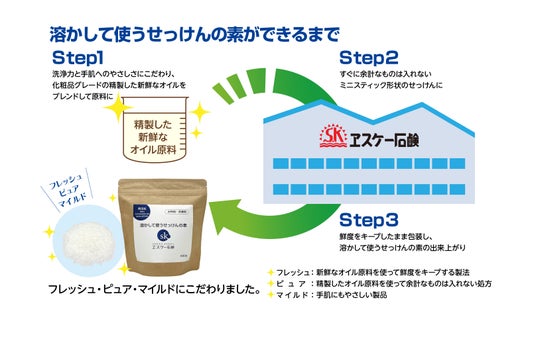 ヱスケー石鹸の余計なものは入れない無添加石鹸製造技術のこと。「溶かして使うせっけんの素<台所・洗濯用>」はPSTでフレッシュ・ピュア・マイルドな石鹸に仕上げました。