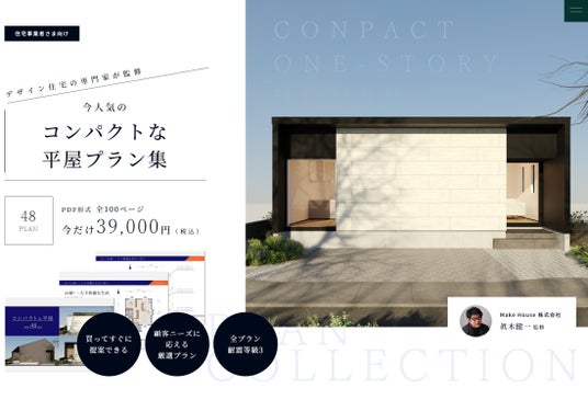 Make House株式会社(本社:東京都港区、代表取締役:眞木健一、以下「Make House」)は、2024年2月1日(木)に住宅事業者向けにデザイン住宅の専門家が監修した今人気の「コンパクトな平屋」プラン集の販売を開始しました。