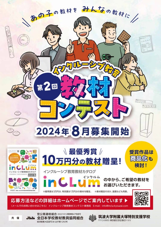 全日本学校教材教具協同組合と筑波大学附属大塚特別支援学校が共催する「インクルーシブ教育教材コンテスト」を開催中です。締切は2024年10月16日。「あの子の教材をみんなの教材に」を合言葉に、審査員によって選出された教材の教材化や、ご応募いただいた皆さまの情報共有を行っています。