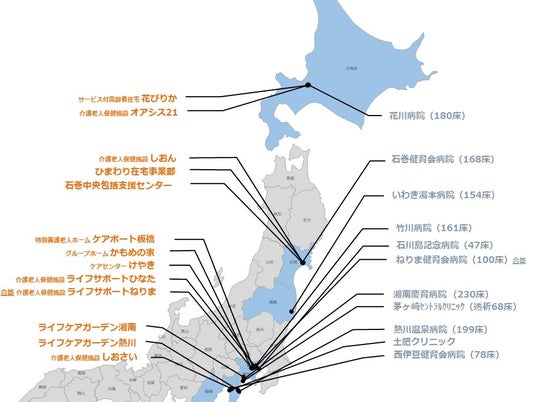 主に東日本を中心に9病院・2クリニック・12介護施設・45介護事業所を有する医療法人グループです。9つの病院を中心に老人保健施設、グループホーム、有料老人ホーム等様々な施設を運営して医療、介護サービスを提供しています。