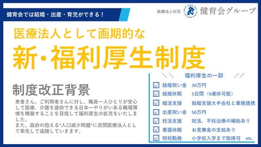 医療法人社団健育会グループ(東京都板橋区 理事長:竹川 節男)は大幅な福利厚生の拡充を図ったことご報告いたします。