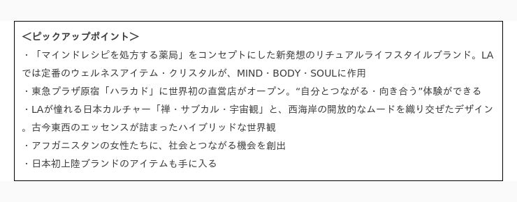 CRYSTAL PHARMACYでは、自然界のミネラル“クリスタル”を使ったマインドレシピを処方。MIND・BODY・SOULに作用する、新発想のホリスティックなアイテムを展開します。また、日本初上陸ブランドを含む、セレクトアイテムも店頭に並びます。