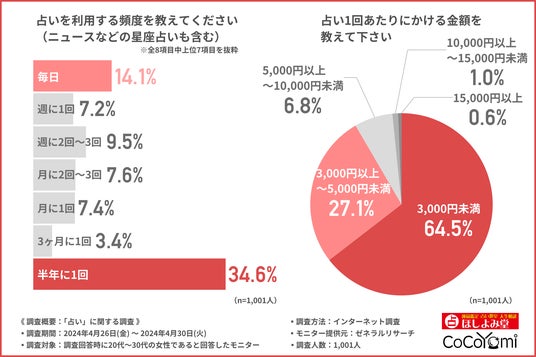 「占いを利用する頻度を教えてください(ニュースなどの星座占いも含む)」と質問したところ、『半年に1回(34.6%)』と回答した方が最も多く、次いで『毎日(14.1%)』『週に2回~3回(9.5%)』と続きました。