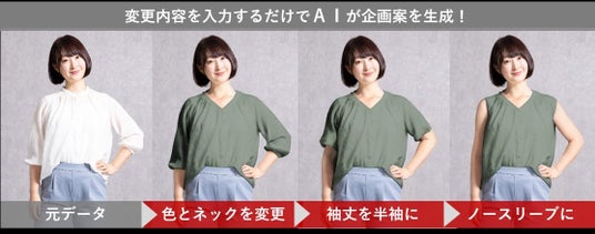 デザイン変更や色・柄の変更を、わずか数クリック・数秒で実施することができるため、アパレル企画業務の大幅な時間短縮が期待できます。難しいプロンプト(テキスト処理)を必要とせず、クリックやドラッグで直感的に操作することが可能です。