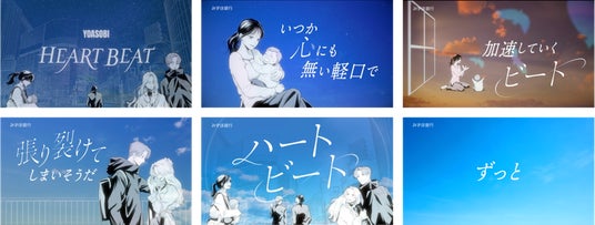 イラストは、漫画「ショジョ恋。」や「推しは自分です」で知られる若手漫画家の山科ティナさんとコラボレーションし、YOASOBIの新曲「HEART BEAT」の歌詞に載せて、年齢や職業が異なるさまざまな方々が悩みや不安に立ち向かっていく様子を、夜が明けていく空の色合いをバックに表現することで、みずほ銀行の「人々に寄り添い、背中を押す姿勢」が印象的に伝わる内容となりました。