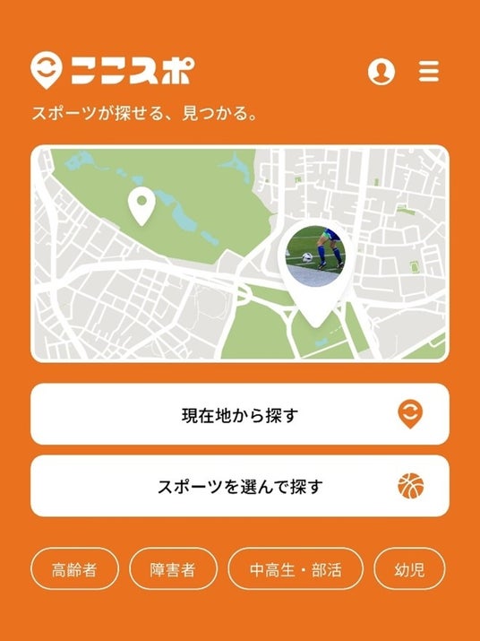 「ここスポ」のサイトを開いているスマートフォンやパソコンのGPS情報に連動して、今、自分がいる場所の近くで開催しているイベントや大会、サークル、またはトレーニングをするための施設、スポーツクラブなどの情報を探すことができます。