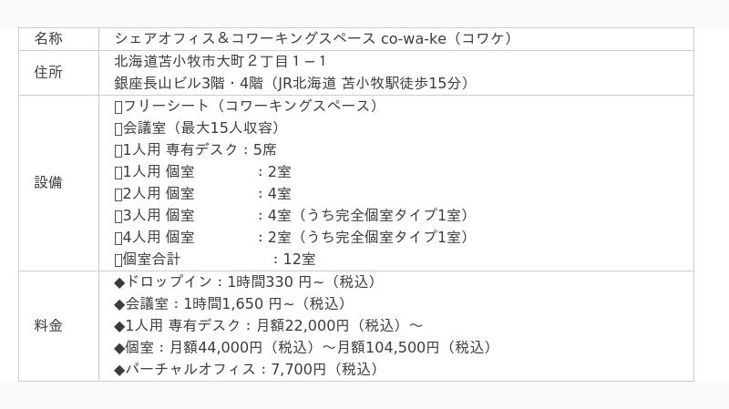 北海道苫小牧市で不動産業を展開する、長山苫小牧不動産株式会社(本社:北海道苫小牧市 代表取締役:長山 恵)は、2024年4月1日(月)にシェアオフィス「co-wa-ke」を開設いたします。また、先行内覧会を3月4日(月)から受け付けいたします。