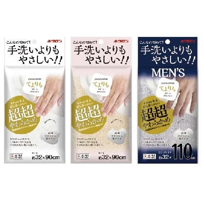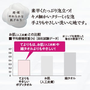 以上の問題を解決できるボディタオル開発を続け、2019 年11 月に「てよりもやさしいボディタオル」を発売。やわらかな繊維を特殊な織り方をすることで従来のボディタオルにない【超超やわらか】な手で洗うよりもやわらかい肌ざわりを実現しています。