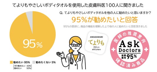 AskDoctors評価サービスの調査に参加した皮膚科医100 名の客観的評価により「医師の確認済み商品」に認定され、95%の医師に商品の機能を理解した上で他の人に勧めたいと回答頂きました。