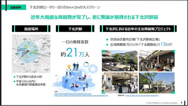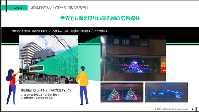 合同会社緑(本社:東京都渋谷区、代表社員:中村怜央)は、下北沢に3Dホログラムサイネージの放映を開始しました。これまでにない”浮かぶ”クリエイティブを配信できるサイネージへのご出稿のお問い合わせをお待ちしております!