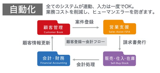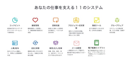 - 全てのサブシステムを使っていくことで、経営と業務の再構築をすることができます。顧客管理・営業支援・勤怠・給与・会計・販売管理・メール配信など、 経営に必要な全てが含まれており、その全てが連動して機能します。