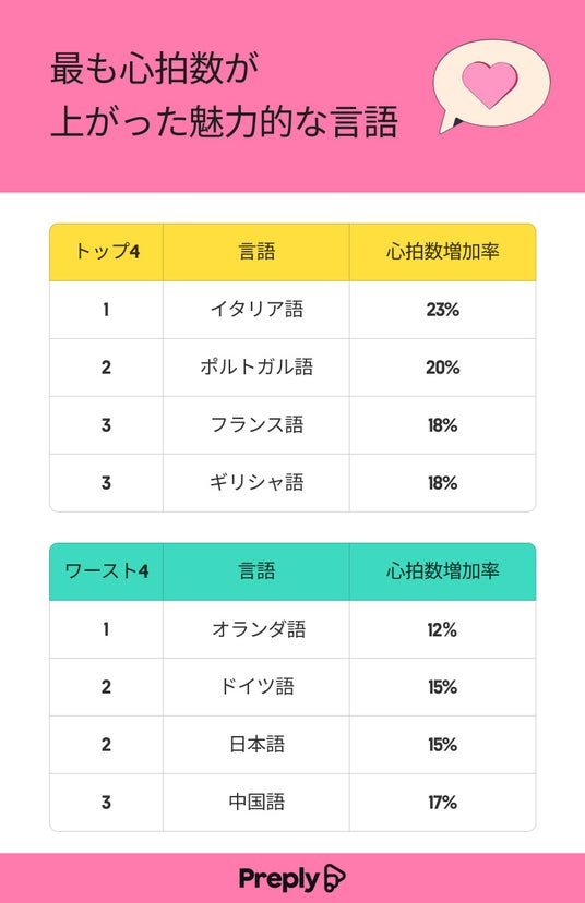 英会話をはじめ、講師とマンツーマンで学習ができるオンライン語学学習プラットフォームを提供するPreply(プレプリー / 米・サンフランシスコ)は、バレンタインデーに合わせて「世界のどの言語が人々の心を最もドキドキさせるか」を明らかにする調査を発表しました。調査の結果、最も人をドキドキさせる言語はイタリア語で、日本語はドイツ語と同率でワースト2位でした。