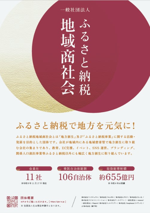 (一社)ふるさと納税地域商社会は、ふるさと納税制度の健全な運用、啓蒙活動を通じて「ふるさと納税で地方を元気に!」を掲げ活動しております。会員企業におけるふるさと納税サポート自治体数は106自治体を数え、取扱寄附額655億円を達成しています。(※令和4年実績・令和5年8月1日総務省発表 現況調査資料より)
