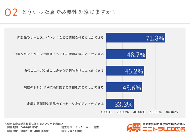 広告の必要性を感じている層に対して、どういった点で必要性を感じているか伺ったところ、「新製品やサービス、イベントなどの情報を得ることができる(71.8%)」と回答した方が最も多い結果となりました。