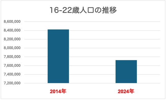 高校生、大学生としてアルバイトに従事する年代(16~22歳)の人口がこの10年で約70万人減少(留学生はコロナ前2019年では31万人)
