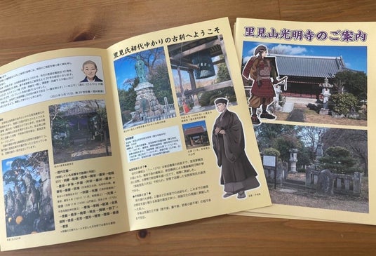 里見山光明寺(群馬県高崎市)のパンフレット。同寺にかかわりのある関東の武将・里見氏や、ゆかりの伝承がある大茶人・千利休をイラスト化して掲載