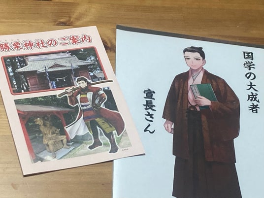 鹿児島県の勝栗神社(湧水町)のパンフレット(左)と本居宣長ノ宮(三重県松阪市)の公式キャラクター「宣長さん」のクリアファイル