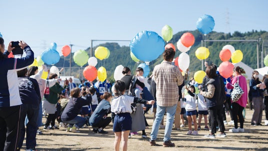 復興を願い風船を飛ばす子どもたち