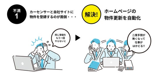 このサービスは、カーセンサーとの物件連動機能が特長であり、中古車販売店の手間を大幅に削減することで、ビジネスオーナーの効率的なWEB運営が期待できます。