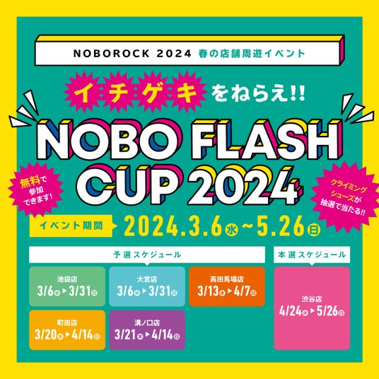 「NOBO FLASH CUP 2024」は、ワントライで何本課題を完登できたかを競うセルフジャッジコンペイベントです。参加者は大宮、池袋、溝ノ口、町田、高田馬場の各予選会場の店舗で用意された30の課題に挑戦します。挑戦は一回限り。予選終了後、渋谷店での本選に参加していただき最終的な順位を競います。