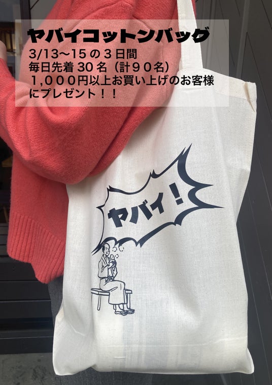 3月13日(水)のオープンから15日(金)までの3日間はオープニングイベントとして、1,000円以上お買い上げのお客様先着30名にオリジナルアイテム「ヤバイコットンバッグ」をプレゼントします。浅草にいそうなおじさんが焼き芋を食べてヤバイ!と叫んでいる可愛いデザインです。