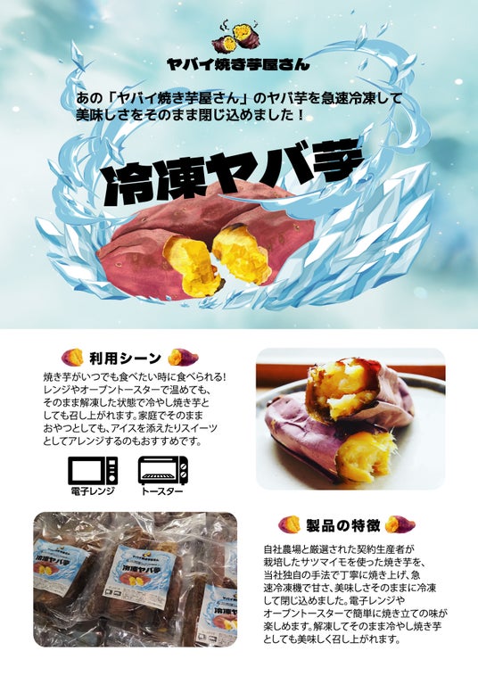 オープン後は店舗に導入した冷凍加工設備(瞬間冷凍機、真空パック機など)を使用して「冷凍ヤバ芋」「冷凍黄金豚ヤバ芋ドッグ」を製造し、体制が整い次第、近日中の発売を目指しております。冷凍商品は自社ECサイトだけでなく、ネットショップや小売店、飲食店などへの展開や輸出への取り組みで、全世界の消費者に召し上がっていただけるよう検討して参ります。