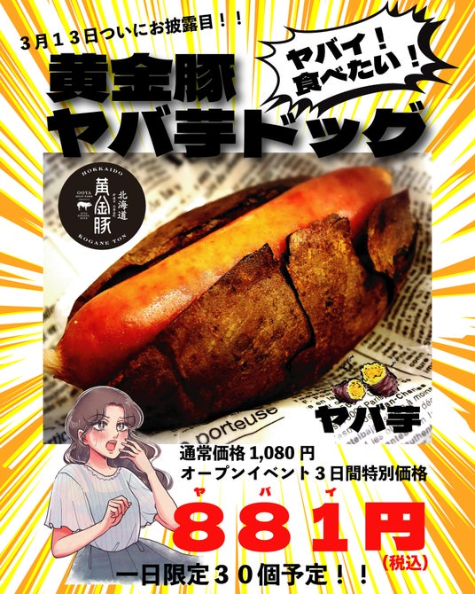 また、オープン前から複数のテレビ番組でも取り上げられたヤバイ焼き芋屋さんの目玉商品、「黄金豚ヤバ芋ドッグ」を通常価格1,080円(税込)のところ、3日間1日30食限定で881(ヤバイ)円(税込)で提供します。