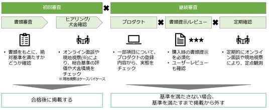 - 2.厳格な審査プロセス当サイトは、初回審査と継続審査を厳格に行います。初回審査では、書面審査のみならずヒアリングや犬舎確認まで行い、上記選定基準をどこまで満たしているか、正確な情報を提供しているかしっかりチェックします。継続審査では、プロダクトを使ったチェックやユーザーへの書類提出の義務づけ、定期的なヒアリング等により、掲載継続可否を判断していきます。なお、多くのサイトは、優良ブリーダーを厳選と謳いつつも、審査ではwebフォームと登録証の提出だけで2,3日で登録できてしまうサイトがほとんどです。