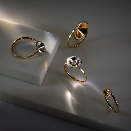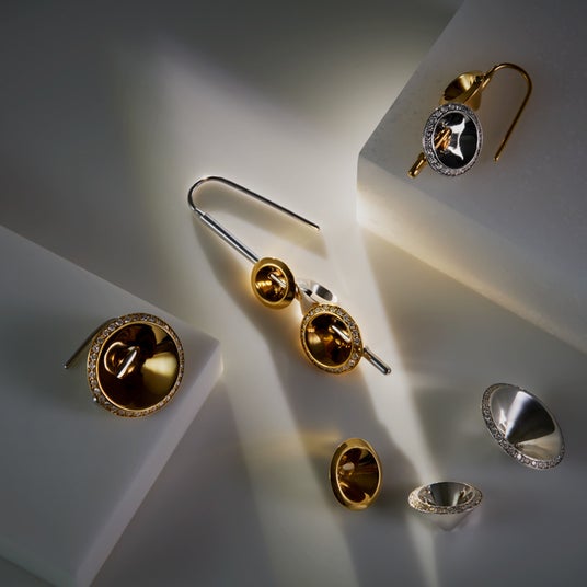 円錐(コーン)のパーツが特徴のデザインはカスタマイズ可能で、着ける人自身がデザインできるアイテムを作りたいという想いから誕生したシリーズです。コーンの大きさ・素材・数、コーンにセッティングするダイヤモンドの有無、そしてコーンを取り付けるアイテムが選択でき、多数のバリエーションからお選びいただきます。