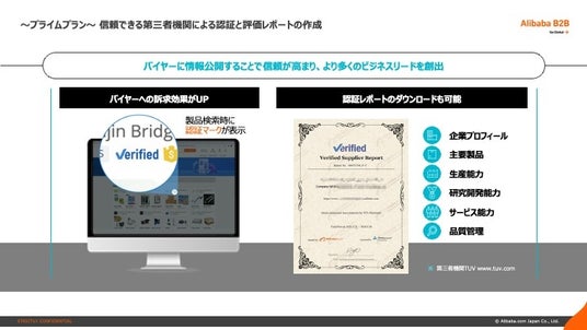 「Alibaba.com プライムプラン」はAlibaba.com の最上位プランであり、海外企業からの信頼をさらに高めることを目的としています。特設ページでの露出や製品上位表示機能、第三者機関による審査を経て認証タグの表示により、海外企業への効果的なPRを行うことを可能にします。
