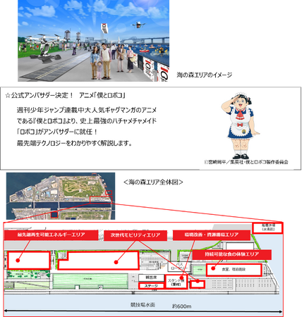 「海の森エリア」には、“陸・海・空”の広大なフィールドが広がっています。フィールドの高いポテンシャルを生かし、先行プロジェクト(※)として「次世代モビリティ」、「最先端再生可能エネルギー」、「環境改善・資源循環」の3つのテーマで東京が目指す「未来のまち」の実現に関わるさまざまな最先端テクノロジーの実装が行われています。「海の森エリア」では、これらの展示を行うとともに、アニメ「僕とロボコ」のキャラクター・ロボコの案内で、先行プロジェクトの技術をわかりやすくご理解いただけるよう、様々なコンテンツの実演・体験を用意します。