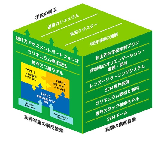 「SEM」は、場、カリキュラム、リソース含め学校全体で拡充教育を行い、「学校全体の改善(total school improvement)」を最終ゴールとしています。SEMの中核をなす「ETM:拡充三つ組モデル」では、子ども一人ひとりの「好き」や「興味関心」を揺るぎなき土台とし、そこから、世界で1つの、答えのない「本物の課題(Real Problem)」を探し、自分だけの学びを創っていきます。インクルーシブな才能教育である「SEM」は、子どもにラベルを貼ったりカテゴリーで分けたりすることなく、個人の特性に合わせた最適な学びを進めることで、すべての子の才能を伸ばすことが可能です。