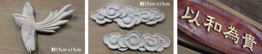 有名神社の改築時に出された蘇材の有効活用に際しては、自社で長年培ってきた木工彫刻技術を活かし、企業や事業の繁栄に繋がる神棚の彫刻物(カササギ/瑞雲/文字・梵字・社章など)を制作。彫刻物ごとに祈祷を行って、お届けいたします。