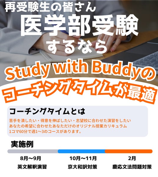 オンライン塾Study with Buddy(代表社員:小林立弥、山本和志、吉田圭佑)は自宅で浪人をする宅浪生、大学で浪人をする仮面浪人、社会人になってからもう一度受験をする再受験生のためのサービスを2023年4月から開始し、2024年4月よりリニューアルします。