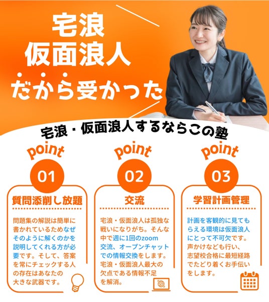 3:勉強コミュニティ:特に孤独になりがちな宅浪生や仮面浪人生、再受験生のために勉強状況の共有や悩みの相談、受験に関する最新情報が得られる塾生同士のコミュニティが開かれます。