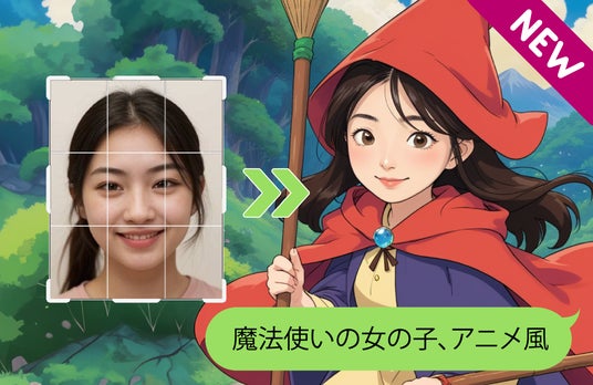 変身モード「魔法使いの女の子、アニメ風」変身モード一枚の顔写真から、CGアニメや漫画のキャラクターに大変身。家族や友達と一緒に、好きなスタイルを試してみませんか?