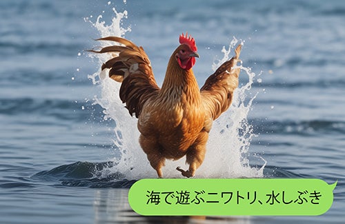 文字からモード「海で遊ぶニワトリ、水しぶき」