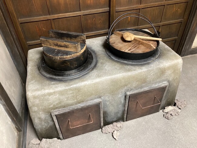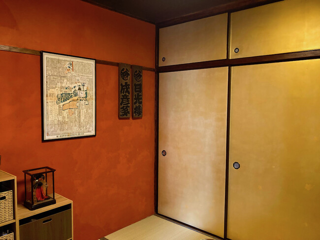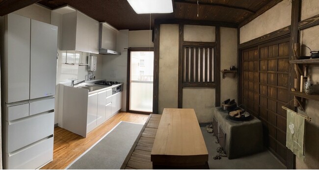 キッチンスペースに江戸と令和が同居。遊郭の茶屋をイメージした和室で調理と食事を楽しむ。